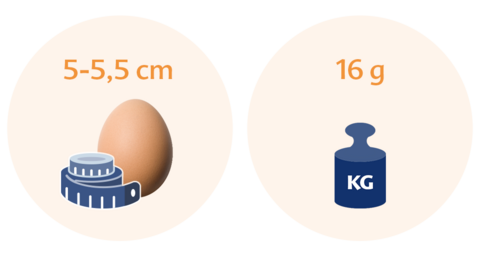By now, your baby is more than 5 cm in size, so about as big as an extra large egg, and weighs about 16 grams. Sizes can vary, however, as each child develops at their own pace. Your baby will be constantly moving about in your womb, which means it’s hard to measure their size completely accurately. Another reason why babies at this stage won’t all be the same size is the genetic information from their father and mother. These differences in size and weight will become even more pronounced during the second trimester, which will begin in two weeks.